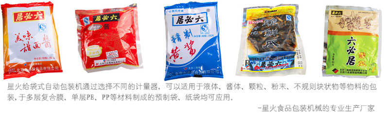 六必居的醬菜所以出名,與它選料精細、制作嚴格分不開。六必居醬菜的原料,都有固定的產(chǎn)地。六必居有十二種傳統(tǒng)產(chǎn)品,它們是:甜醬黑菜甜醬八寶菜、甜醬八寶瓜、甜醬黃瓜、甜醬甜露、甜醬姜芽、甜醬什香菜、甜醬小醬蘿卜、甜醬瓜、白糖蒜、稀黃醬、鋪淋醬油。這些產(chǎn)品色澤鮮亮,醬味濃郁,脆嫩清香,咸甜適度,F(xiàn)在,不少傳統(tǒng)名牌醬菜,還制成罐頭,遠銷國外。六必居也是星火北京食品包裝機械的主要客戶之一,給袋式自動包裝機用于干黃醬、甜面醬、麻辣花生、特味脆鮮瓜、雪菜的包裝。包裝產(chǎn)品如下圖: