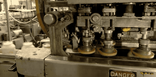 接下來是熱感密封。買到的醬料都有一層鋁箔的封口膜,就是那個一面銀色的圓形小紙板。流水線上采用了電磁感應鋁箔封口機,是用感應加熱的方式密封的。給罐子擰上蓋子后,有感應機器只在罐口部位加熱一下下,就把封口膜粘住密封了,局部的感應加熱好處是不會燙到內部的蛋黃醬,畢竟醬料是很容易變質的。