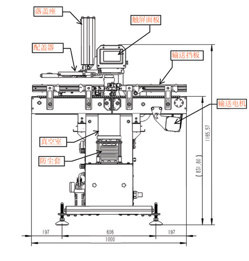 完成灌裝工序沒有加蓋子的瓶子從機器的進出罐輸送左側(cè)進入,在輸送器的兩側(cè)擋板上裝有氣動的擋罐裝置,擋罐器的作用是確保每次只有一個瓶子進入推送位置,并且在在抽真空旋蓋過程中其它瓶子不會誤入。