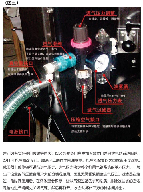 壓縮空氣:泵流量要求0.11 立方每分鐘以上,0.7 兆帕(7 公斤每平方厘米);